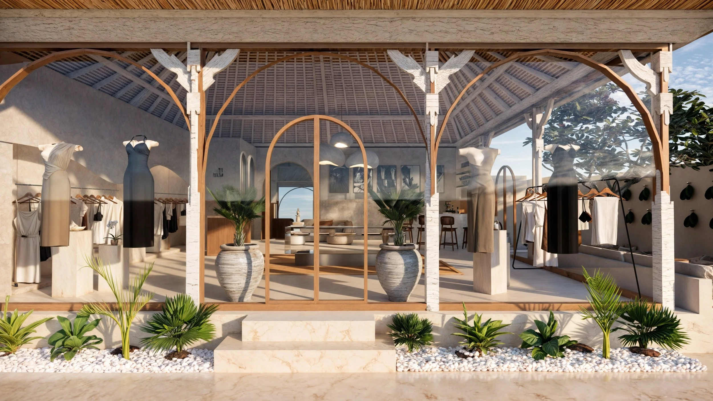 Pour ce projet, le parti pris repose sur une esthétique épurée et minimaliste, où les formes organiques se marient harmonieusement avec des matériaux naturels tels que le bois, le béton, la chaux et le lin. Le design intègre subtilement des rappels aux îles à travers des éléments comme les suspensions et les revêtements de bar en carreaux nacrés. L'objectif est de créer une atmosphère qui évoque l'essence même de Bali tout en respectant et en mettant en valeur la structure originale afin de préserver son caractère authentique.